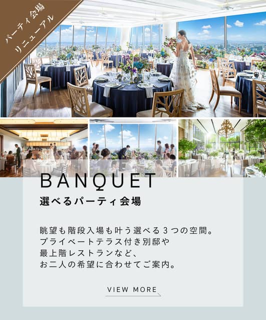青空が祝福する最上階のウェディングステージ、